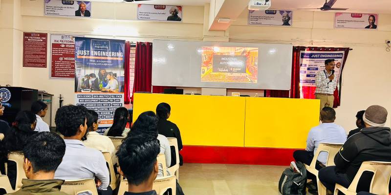The expert lecture on PLC and SCADA was conducted to provide students with in-depth knowledge of industrial automation systems and their real-time applications in industries such as manufacturing, power plants, process industries, and smart infrastructure. The resource person from Just Engineering explained the fundamentals of PLC architecture, programming concepts, and the role of SCADA in monitoring, control, and data acquisition.