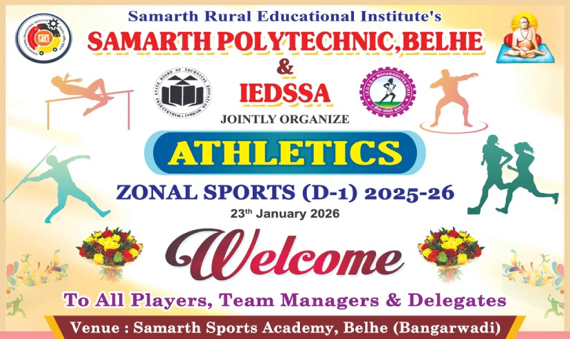 As part of the institute’s commitment to holistic student development, students are consistently encouraged to participate in extracurricular and co-curricular activities, including sports. In line with this objective, the Boys Athletics Team of the institute participated in the Zonal Sports Competition 2025–26 organized by Samarth Polytechnic, Belhe. The competition provided a structured platform for students to demonstrate physical fitness, discipline, teamwork, and competitive skills at the zonal level.